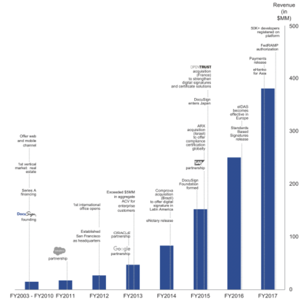 While e-signatures are a relatively new phenomenon in Japan, they have been around since the early 2000s in the US with DocuSign which was founded in 2003. DocuSign went public in April 2018 with $348.6m in subscription revenue in January 2017. Though there was no precise data on DocuSign’s earlier revenue, the following chart included in DocuSign’s S-1 indicates that DocuSign crossed the $100m mark 11 to 12 years in.