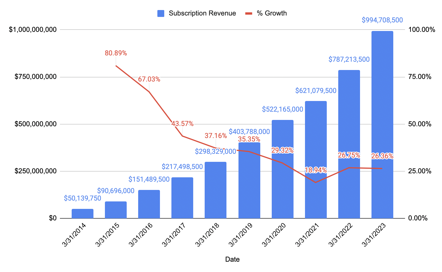 SmartHR crossed the 15b JPY ($100m) mark in 2024, 11 years after being founded. This number is purely subscription revenue. It looks like Workday’s subscription revenue crossed the 100m USD mark in 2013 after about 8 years of starting: