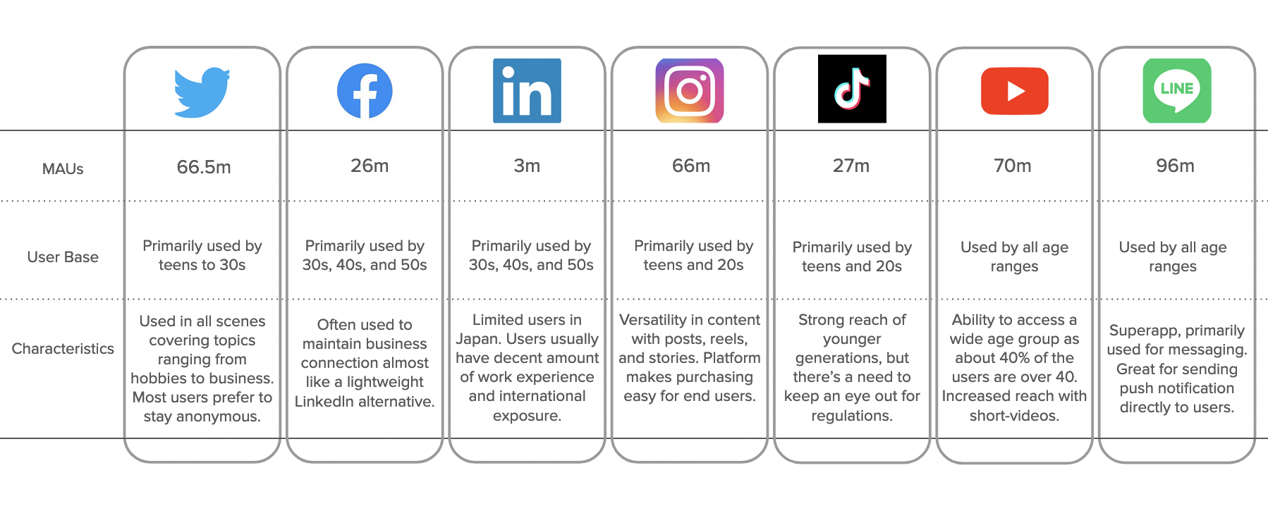 It’s common for a single user to create multiple accounts (often staying anonymous) using them for different social situations. X (Twitter) is also quite versatile in how users engage the platform. Users may use it purely socially and casually, but some users derive business insights from X (Twitter). The platform is commonly used to find honest reviews of products. It’s also quite common to use X (Twitter) as a business channel since LinkedIn penetration is very low in Japan.