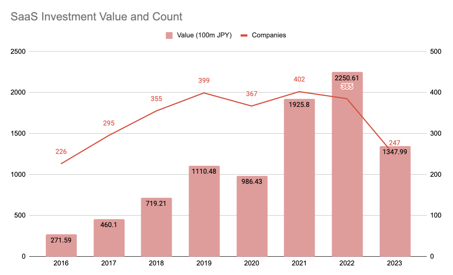 SaaS investments saw a dip in 2023 compared to 2024. SaaS investments may bounce back to higher numbers than in 2022. With the Nikkei reaching record highs, global investors are looking to access Japan. With an influx of foreign investors and a strong base of domestic investors, the desire to invest in Japan exists.