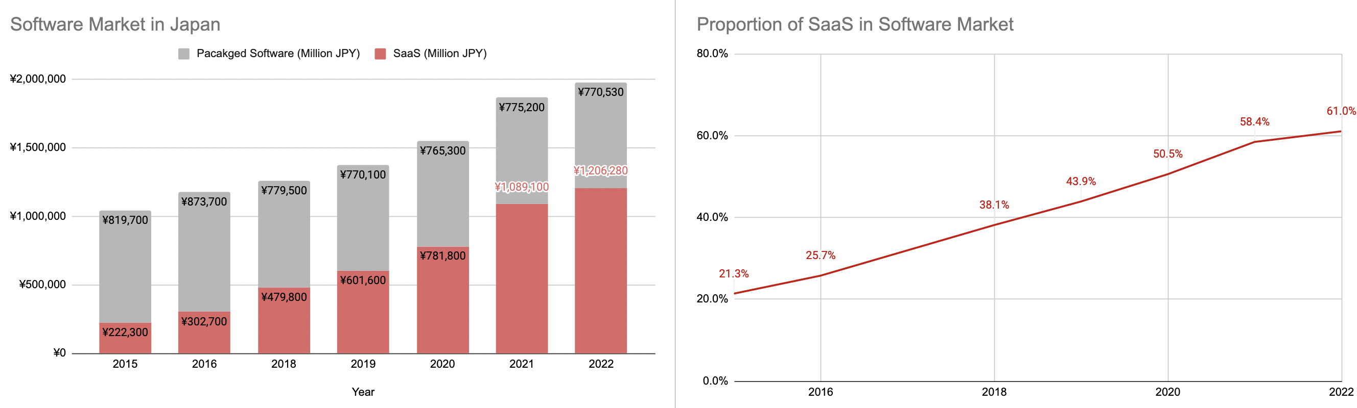 SaaS in Japan is in the midst of high growth with more companies. From the end of 2015 to 2022, the SaaS market experienced over a 30% CAGR and is expected to continue its growth. Software in Japan is still catching up to other markets. Still, being the second largest enterprise software market worldwide, SaaS will continue to be an interesting and important market for global companies and investors. For the 2024 funding funding trends, you can visit this post.